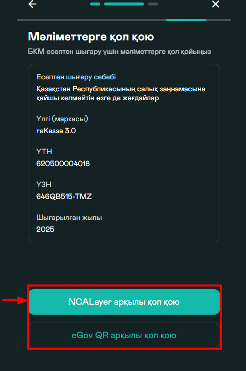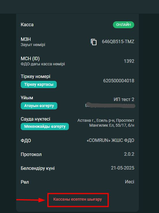 Кассані есептен шығарған кейін ол автоматты түрде «Менің кассаларым» бөліміндегі "Мұрағатқа" түседі. Алып тастағаннан кейін осы кассадағы «Касса баптаулары» бөлімінен есептен шешілген туралы тіркеу картасын жүктеуге болады.