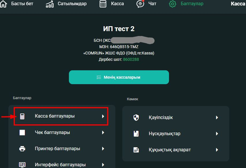 1."Баптаулар" бөлімінде "касса баптаулары" батырмасын басыңыз