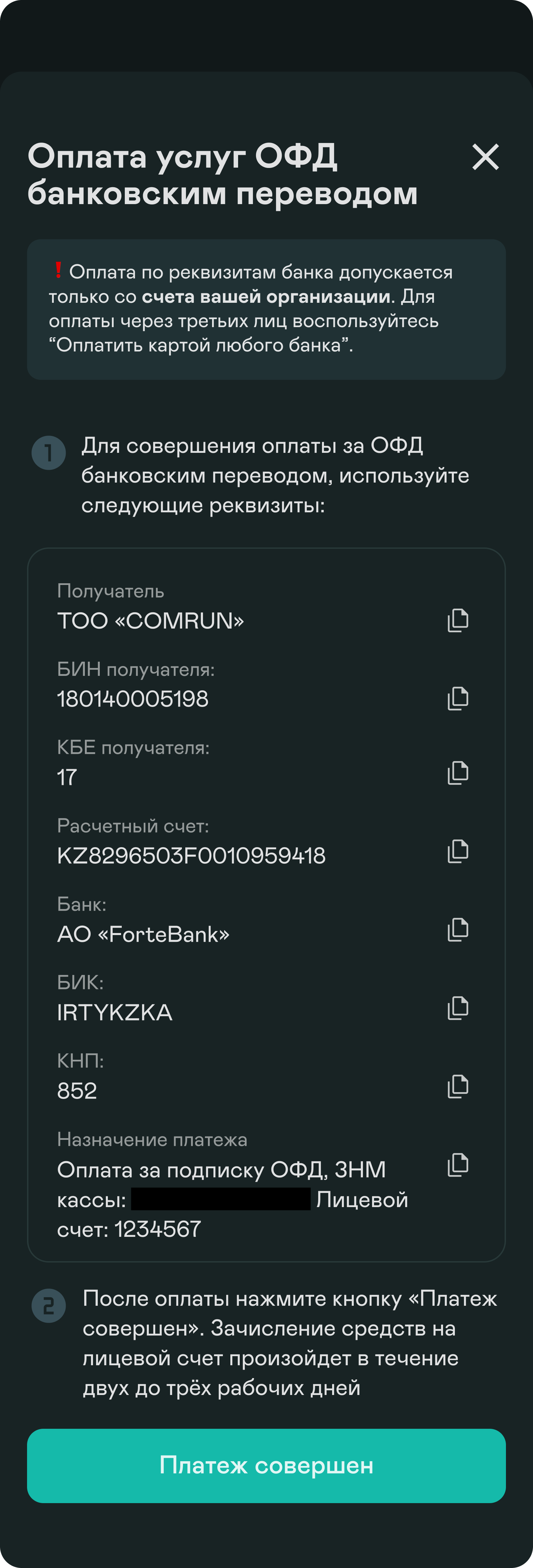 Готово! Теперь оплата спишется с лицевого счета. После пробития первого чека, касса перейдет в онлайн режим и статус поменяетсяна "активна".