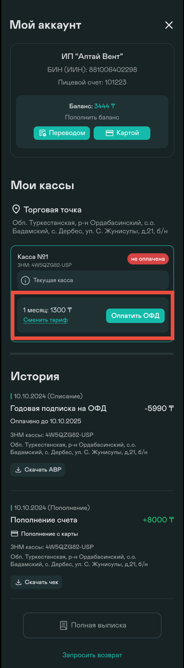 1. После поступления оплаты на ваш баланс счета вам нужно перейти в раздел "Мои подписки" -" Кассы и ОФД" далее нажать на кнопку "Оплатить ОФД"