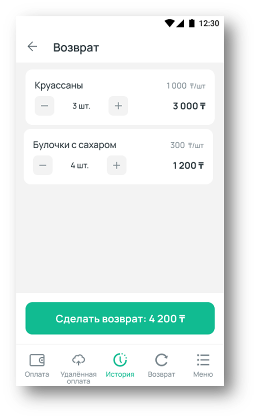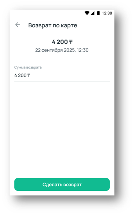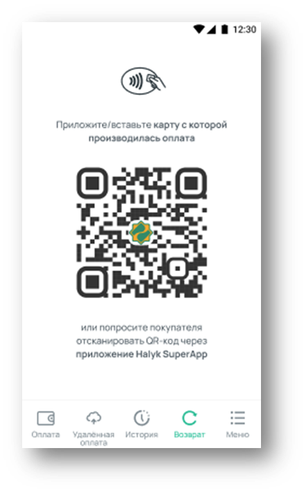 1. На основном экране нажмите «Возврат» Покупатель должен отсканировать QR код или приложить карту для осуществления возврата
