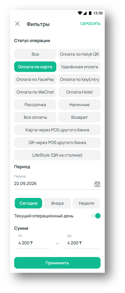 2. Фильтр поиска операций в истории дополнен новыми типами оплат. Выберите нужный фильтр и нажмите «Применить»