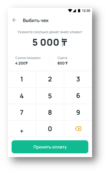 3. Выбирая тип оплаты «Наличными», можно указать принимаемую сумму наличными, на калькуляторе будет указана сдача, при наличии