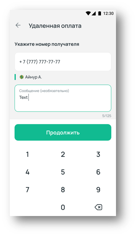 2. Необходимо указать номер получателя удаленной оплаты. При необходимости можете заполнить поле для сообщения. Далее нажмите «Продолжить»