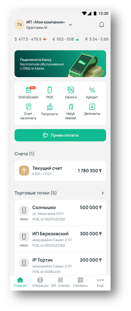 1. В приложении "Onlinebank" нажмите на торговую точку либо на зеленый баннер на главном экране