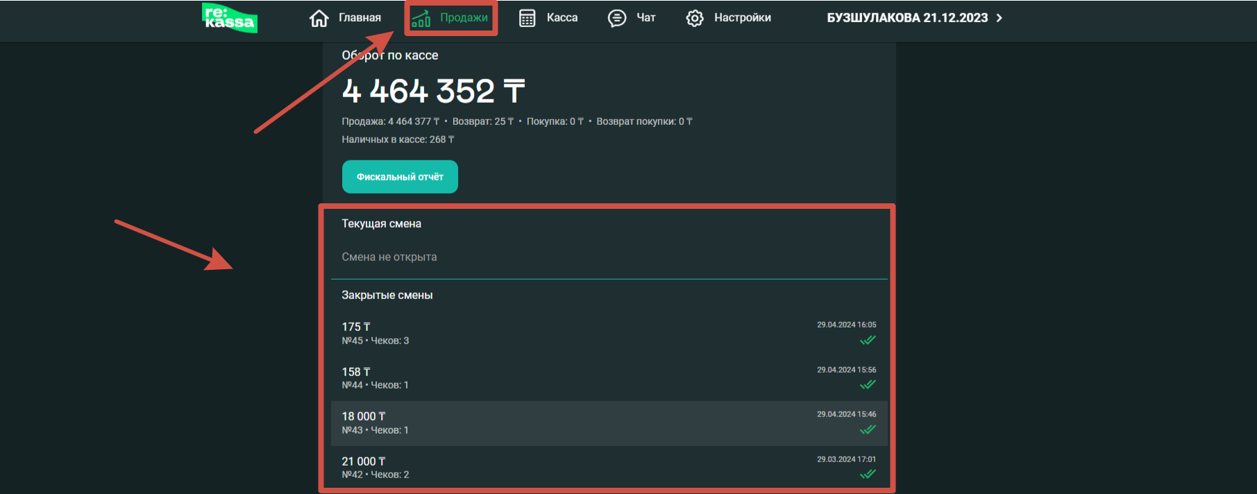 В разделе "Продажи" можно посмотреть Ваши смены и пробитые чеки