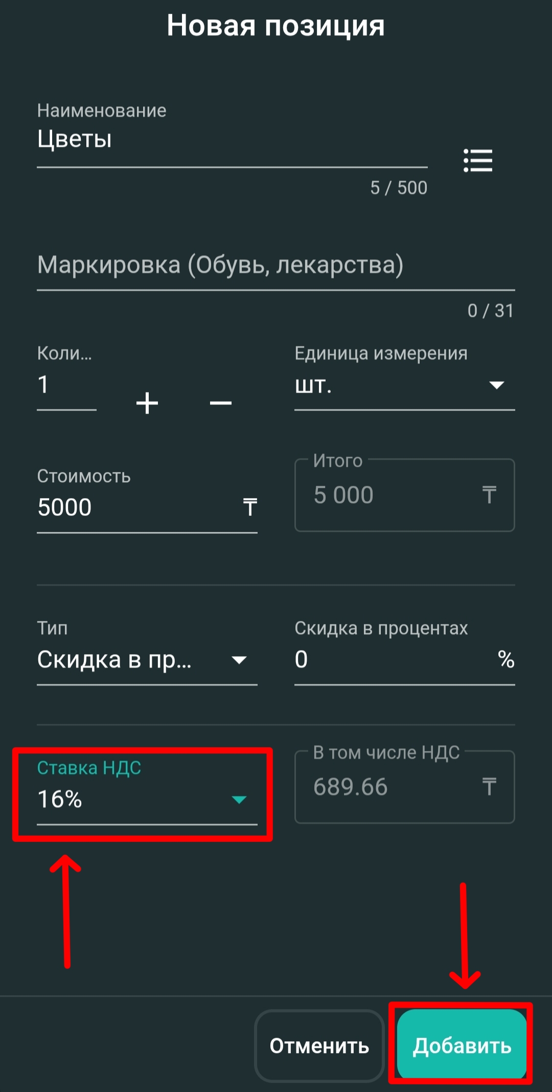 3. Заполните данные товара и выберите ставку в разделе "Ставка НДС". После нажмите "ДОБАВИТЬ"