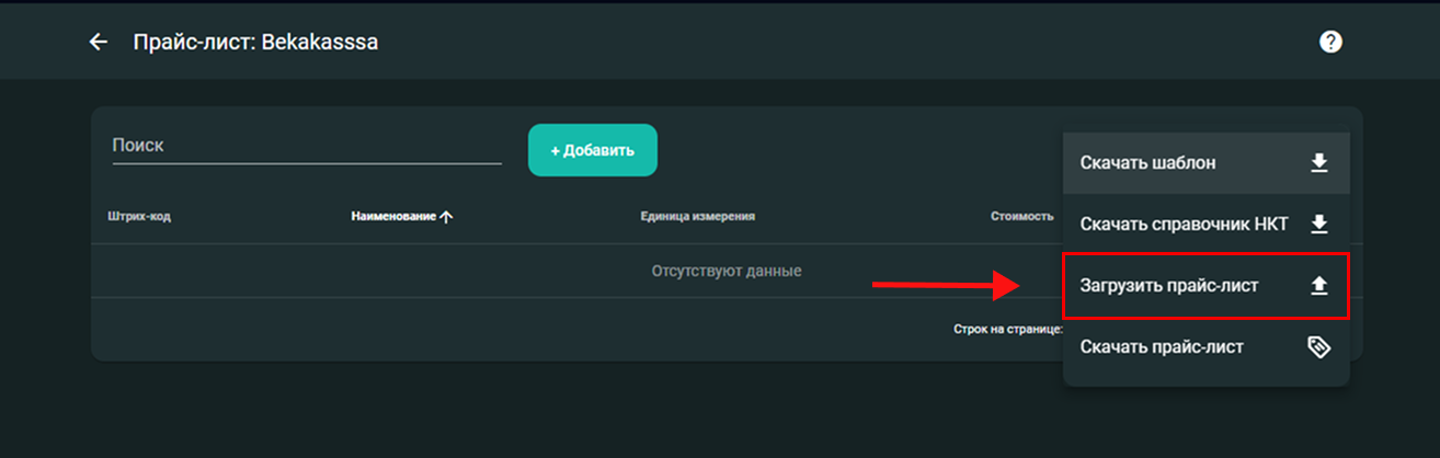 2. Нажать "МЕНЮ" - Загрузить прайс-лист