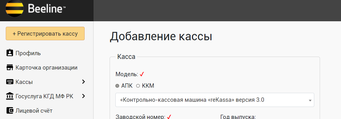Вписываем «Заводской номер» и год выпуска кассы (можно взять здесь). Выбираем адрес и нажимаем "Сохранить".